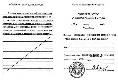 В тяжелые 90-ые годы, с приходом «дикого рынка», разрушением экономических, социальных, человеческих связей особенно в тяжелом положении оказались территории Крайнего Севера и его жители. Именно поэтому города и районы поддержали Воркуту, Инту, объединившись для спасения от общей беды. Была создана ассоциация — Союз городов Заполярья и Крайнего Севера, зарегистрированная 5 октября 1992 г. отделом юстиции Мурманского Облисполкома, а 28 декабря 1993 г. – Министерством юстиции РФ.